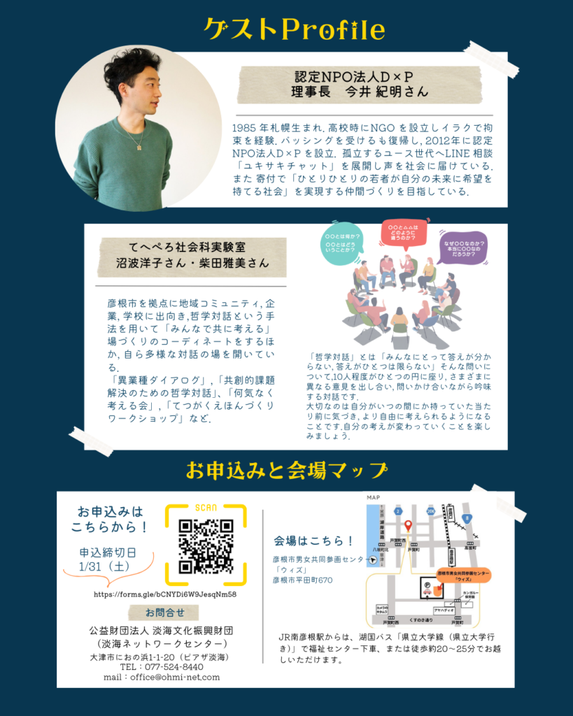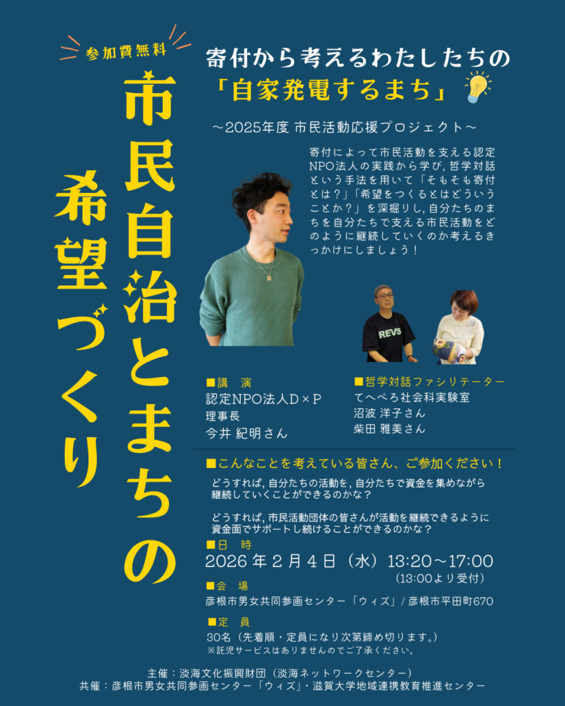 いま、地域の活動を支える「寄付」は、単なるお金のやり取りではなく、まちを明るく動かすための“自家発電”のエネルギーになりつつあります。今年の「市民活動応援プロジェクト」では、若者支援の最前線で寄付文化を築いてきた認定NPO法人DxPの今井紀明さんをお招きします。さらに、後半は「哲学対話」の時間。 「なぜ寄付が必要なの?」「自分たちのまちに何ができる?」といった問いを、参加者みんなでじっくり深掘りします。答えを出すことよりも、対話を通して新しい「気づき」を見つける時間です。