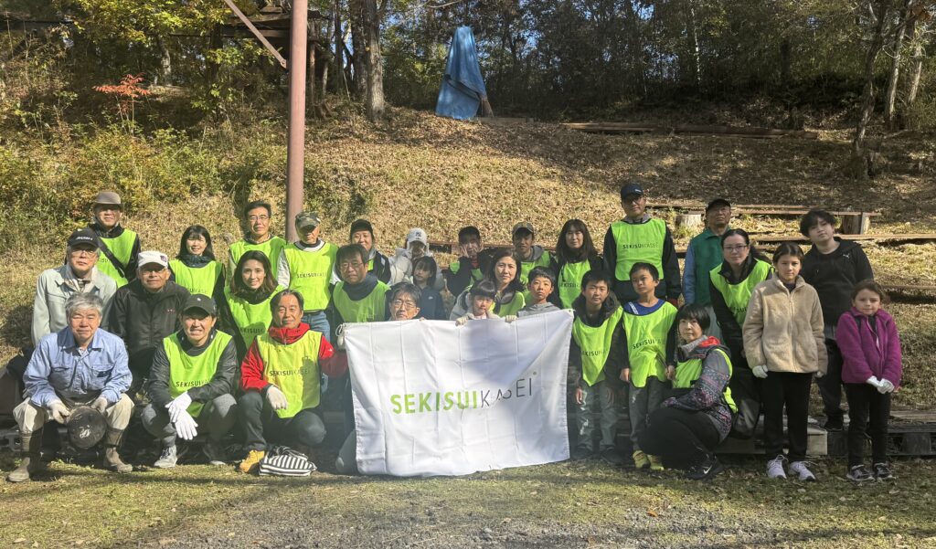 未来ファンドおうみのカ冠基金のひとつ、『積水化成品基金』は、積水化成品工業株式会社様からの寄付により2012年に設立されました。この基金は、市民による環境保全活動の充実をめざし、年間をとおして継続的におこなわれる活動に助成され、あわせて積水化成品グループ社員も社会貢献活動としてボランティア参加できる活動を対象としています。今年度の『積水化成品基金』の採択団体は「特定非営利活動法人甲賀市の甲賀の環境・里山元気会」さん。甲賀市で地域の里山の整備活動を主に20年以上も活動を続けておられる団体さんです。この里山の整備事業に1日、ボランティアに入っていただこうと11月22日(とてもいい天気でした!)、積水化成品グループ社員のみなさんがたくさん参加していただきました。親子での参加も多く、子どもたちも歩道の清掃(落ち葉がいっぱい!)に大活躍!なかなか手が回らない力仕事もこの日は、みなさんのご協力でかなり進んだようです。そして作業のあとは、里山元気会さんから炊き込みご飯と豚汁が振る舞われました。ひと汗かいた後、とびきり美味しかったのでないでしょうか?